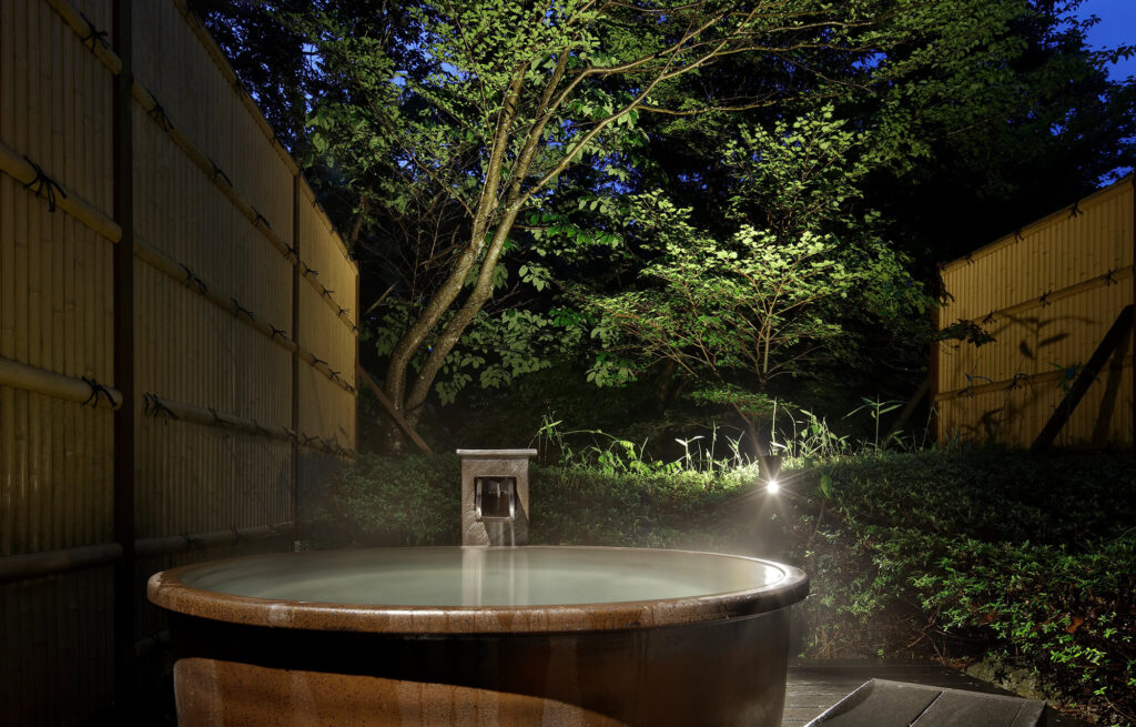 蓮台寺温泉の源泉かけ流しを堪能でき、全室に設けられた露天風呂付き客室では、プライベートな空間で新鮮なお湯を独り占め!