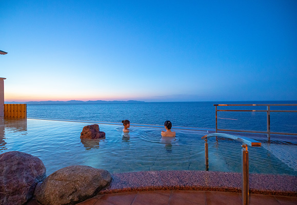 日本海からの日の出や漁火などの絶景を独り占めしながら、源泉かけ流しの温泉を堪能できる贅沢な造りになっており、泉質は肌に優しい塩化物泉で「美肌の湯」としても有名です。
