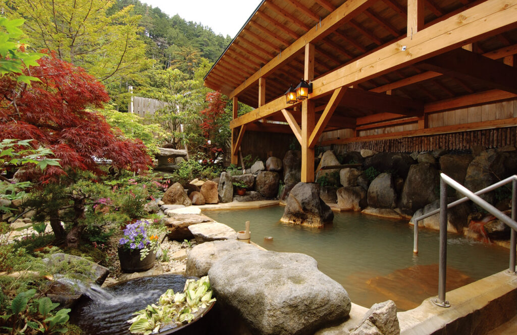 温泉は、雄大な木曽の山々を望む巨石を配した広大な庭園露天風呂が自慢で、自然との一体感を味わいながら湯浴みできるのがポイント!