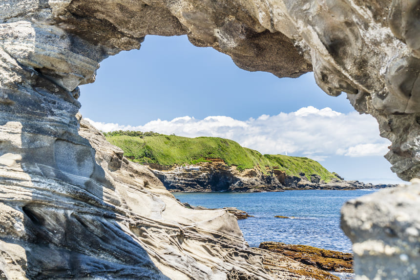 波の浸食によってできた巨大な岩のアーチ・馬の背洞門越しに見る景色は、自然の力強さを感じる絶景スポットです。