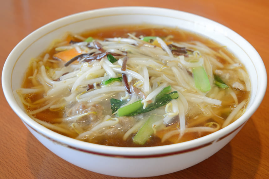 醤油ベースのスープにもやしや豚肉、白菜などを炒めた熱々の餡がたっぷりかかっているのが特徴です。