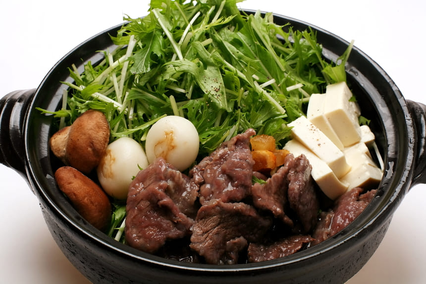 「ハリハリ」という言葉は、具材の主役である水菜のシャキシャキとした歯ごたえを表現した擬音を表しています。